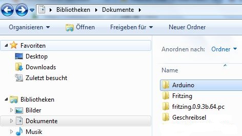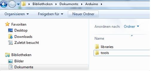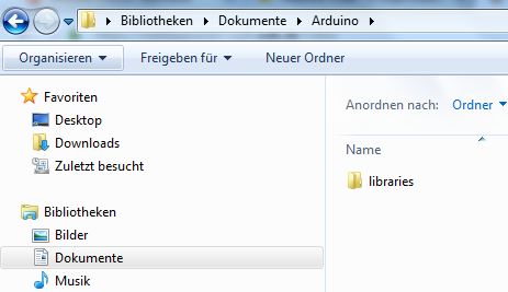 Der Ordner "Eigene Dateien\Bibliotheken\Dokumente\Arduino" muss geöffnet werden: