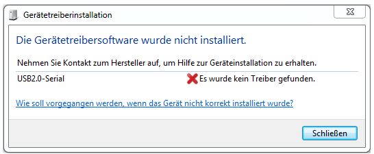 Ein Zeichen dafür, dass irgendetwas bei der Installation der USB Treiber nicht geklapt hat, könnte diese Fehlermeldung sein: