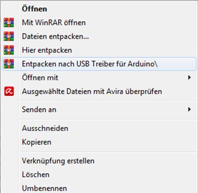 Dazu in den Downloadordner wechseln. Mit einem Rechtsklick auf die Datei "USB Treiber für Arduino.zip" den Menüpunkt "Hier entpacken" oder "Entpacken nach USB Treiber für Arduino\" wählen: