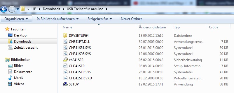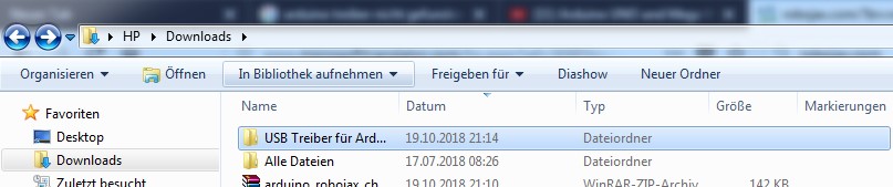 Um das Problem zu beheben, muss man diese Treiberdateien herunterladen (Größe: 142kB). Im Downloadordner sollte nach kurzer Zeit die Datei "USB Treiber für Arduino.zip" angekommen sein: