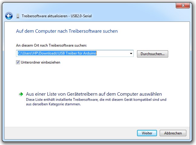 Danach öffnet sich ein Fenster, in das man den Pfad der zu installierenden Treiber angibt: