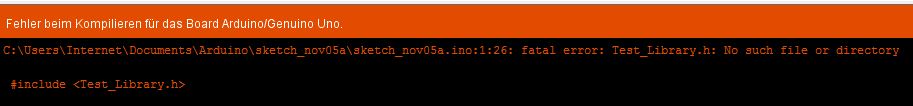 Wenn die Library noch nicht im Arduino-Verzeichnis aufgelistet ist, dann erscheint nach dem Compilieren bzw. beim Hochladen diese Fehlermeldung: