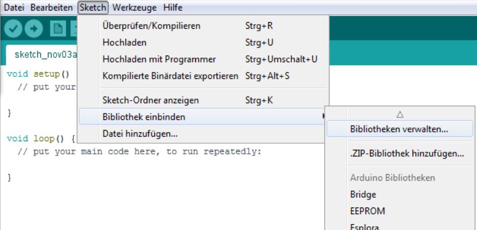 Im Menü "Sketch" wählt man den Punkt "Bibliothek einbinden":