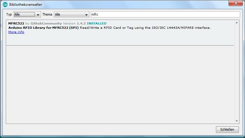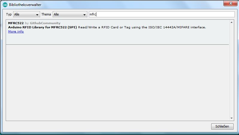 Im Beispiel wurde "mfrc" eingegeben. Nach kurzer Suche erscheint auch die Bibliothek "MFRC522". Das ist die Bibliothek, die die Befehle zum Einlesen eines RFID-Chips bereitstellt. Auf "More info" klicken: