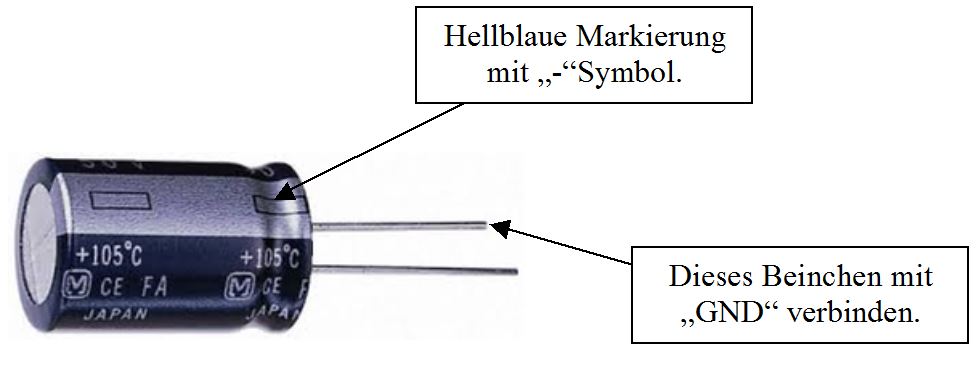 Die Elkos sind gepolt, d.h. beim Einbau ist darauf zu achten, welche Beinchen wie angeschlossen werden: