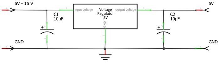 Eingangs - und Ausgangsspannung werden zusätzlich mit einem 10µF Elektrolytkondensator (Elko) mit GND verbunden.