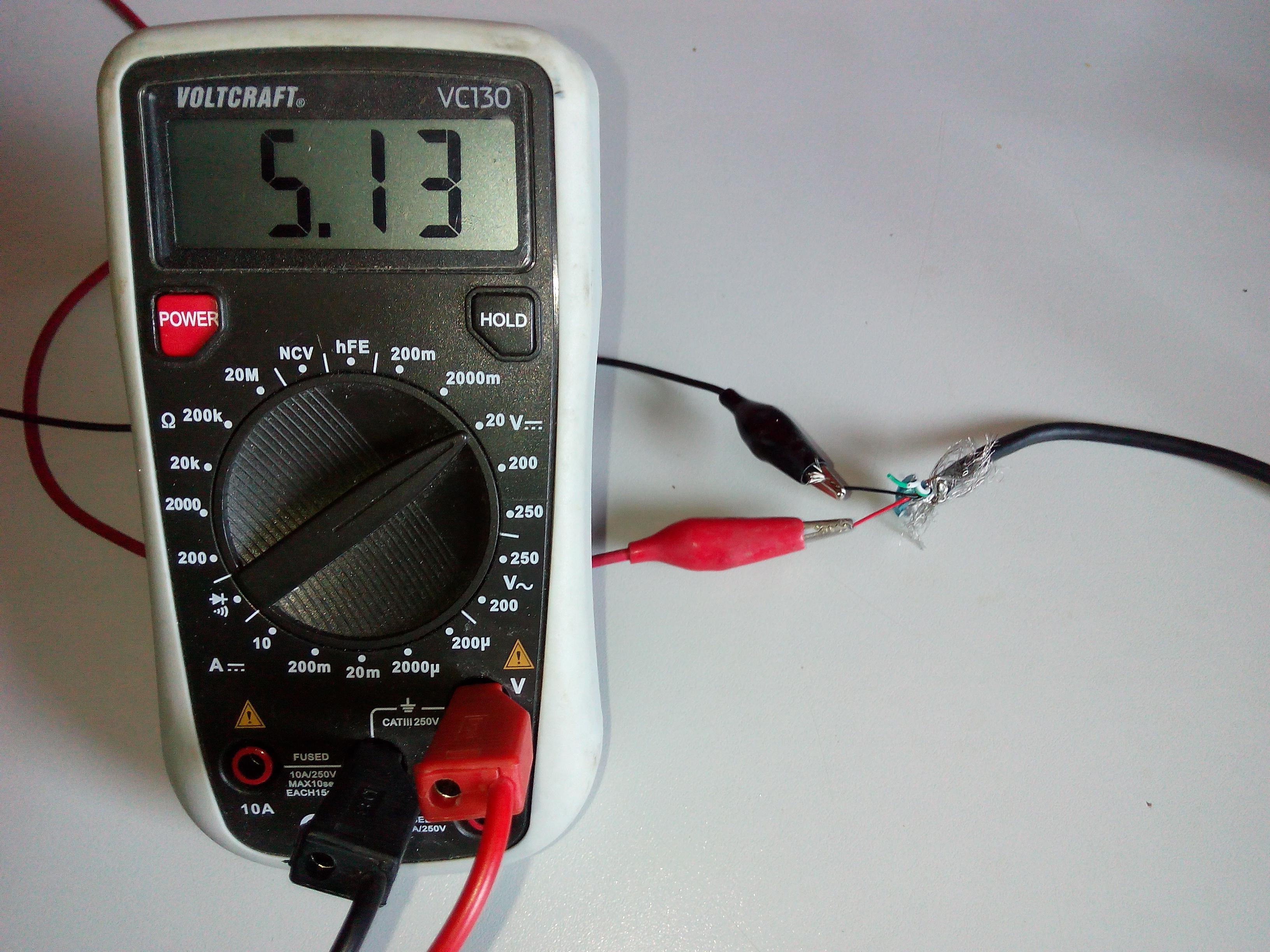 Mit einem Multimeter kann man die Polarität und die Spannung überprüfen: Die rot isolierte Litze sollte der Pluspol, die schwarz isolierte Lite sollte der Minuspol der zu messenden Spannung von etwa 5V sein.