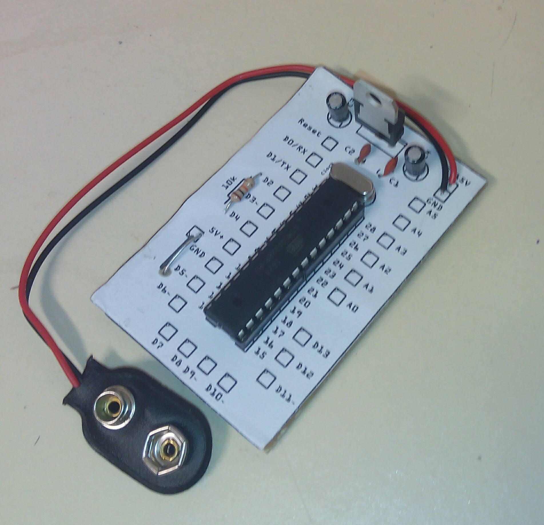 Ein Arduino Standalone, komplett mit allen benötigten Bauteilen und mit Spannungsversorgung durch einen 7805 auf einer Platine gelötet. Der IC steckt in einem Sockel. Die Anschlüsse des IC sind nach außen geführt und beschriftet, so das man sie bequem anlöten kann.