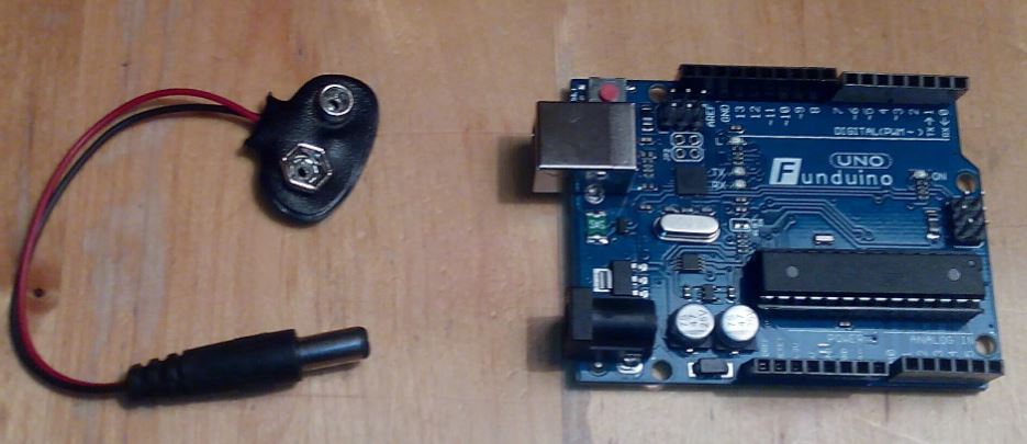 In den meisten Startersets gibt es Stecker, mit denen man den Arduino an eine 9V-Block-Batterie anschließen kann.