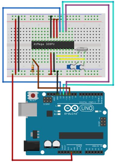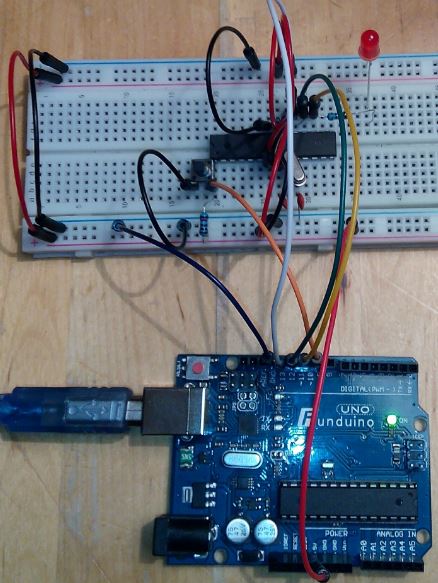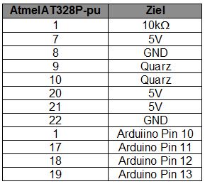 Zusätzlich zu der Grundschaltung wird der Arduino an den Atmel ATMega328P-pu über die Pins 19, 18, 17 und 1 angeschlossen. Ebenso wird Arduino GND mit der GND-Versorgungsleitung der Schaltung verbunden.
