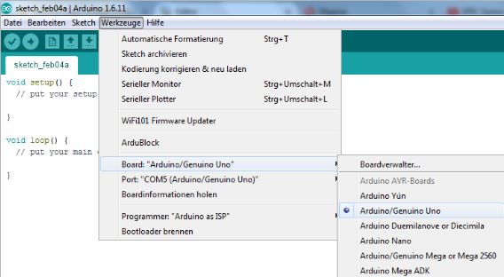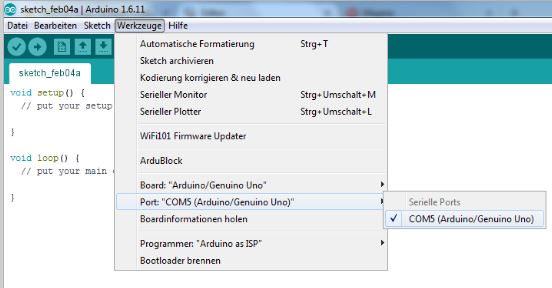 Jetzt bitte überprüfen, ob das Board am richtigen "Com Port" angemeldet ist. Wenn nicht, bitte den richtigen Port anklicken. Hier ist es der Com5-Port. Wahrscheinlich wird bei Dir ein anderer Port angezeigt.