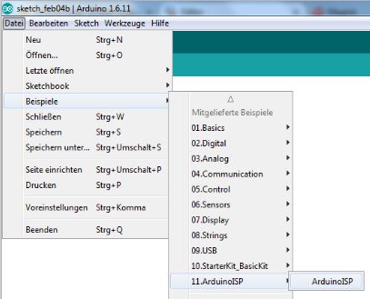Über das Menü "Datei" das Untermenü "Beispiele" öffnen und dort die Datei "ArduinoISP" öffnen. ISP steht für "InSystemProgrammer" und dieses Programm befähigt den Arduino andere Chips zu programmieren.