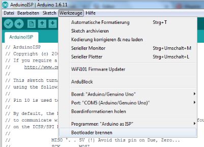 Im Menü "Werkzeuge" auf den Befehl "Bootloader brennen" klicken: