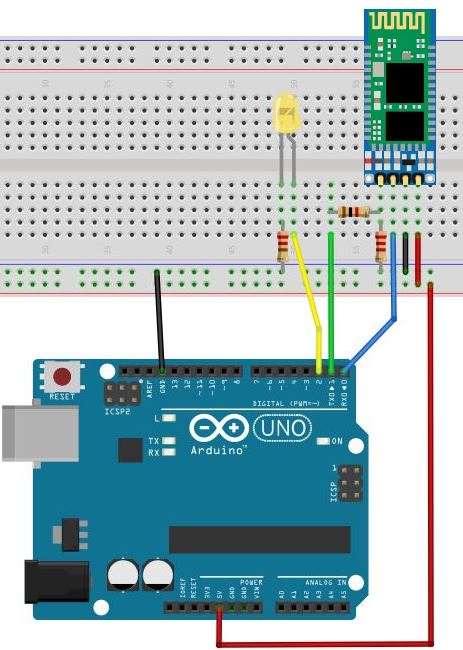 Aufbau der SchaltungZur Grundschaltung für das HC-06 Modul kommt noch eine gelbe Leuchtdiode und ein 220Ohm Widerstand, die an Pin 2 angeschlossen werden. Die Widerstände 1kOhm und 2kOhm bilden einen Spannungsteiler. 1kOhm wird an Digital Pin 1 (TX) angeschlossen, 2kOhm an GND. |