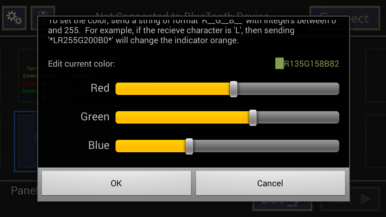 Die Werte oberhalb der Schieberegler (z.B. R135G158B82) muss man sich jetzt merken oder aufschreiben und später in das ArduBlock-Programm oder in den Arduino-Sketch einfügen.