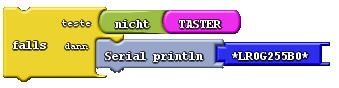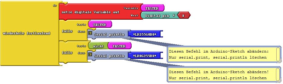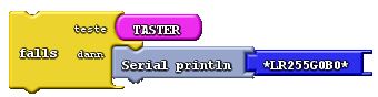 Wenn der Wert der Variable "TASTER" wahr ist, dann wird eine Zeile an den seriellen Monitor und an das Bluetoothmodul HC-06 gesendet. in der Zeile stehen die Zeichen '*' und 'L' , danach der RGB-Wert R255G0B0, was für die Farbe "rot" steht.