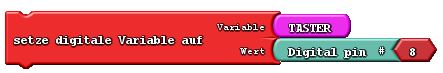 Eine Variable mit dem Namen "TASTER" wird erstellt. Wie erhält den Wert "wahr", wenn am Pin 8 ein Signal von 5V (HIGH) anliegt, also wenn der Taster gedrückt ist. Ist der Taster nicht gedrückt, liegt an Pin 8 eine Spannung von 0V (LOW) an und der Wert der Variable ist dann "falsch".