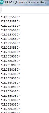 Wenn der Wert der Variable "TASTER" nicht wahr, also falsch ist, dann wird eine Zeile an den seriellen Monitor und an das Bluetoothmodul HC-06 gesendet. in der Zeile stehen die Zeichen '*' und 'L' , danach der RGB-Wert R0G255B0, was für die Farbe "grün" steht. Danach folgt das abschließende Zeichen '*'.