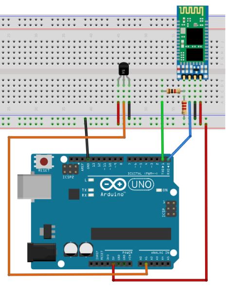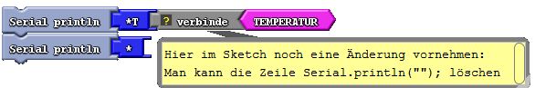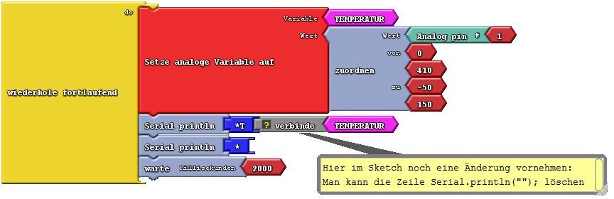 - ... oder Du führst noch eine zweite Umrechnung durch (mit dem "zuordnen" - Befehl, bzw. mit dem "map"-Befehl) und wandelst die Temperatur (von -50°c bis 150°C in Werte zwischen 1 und 100 um, die Du an das Bluetoothmodul sendest.