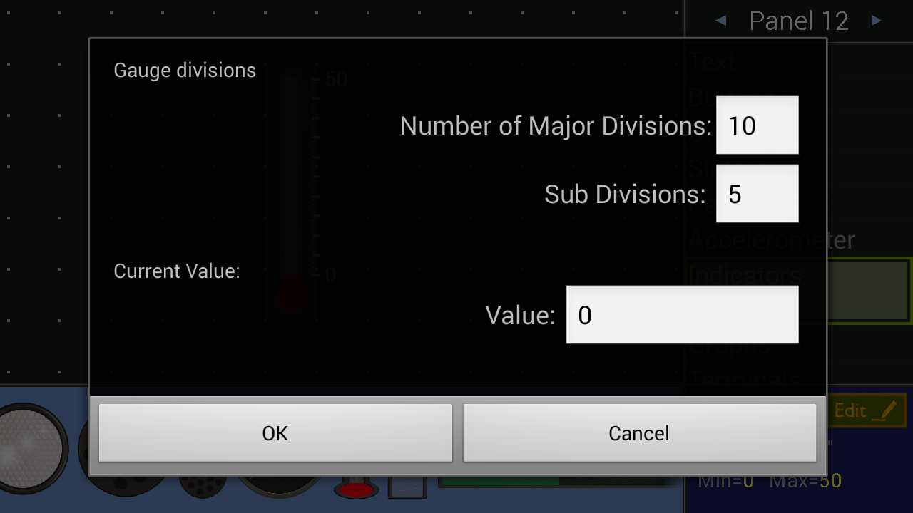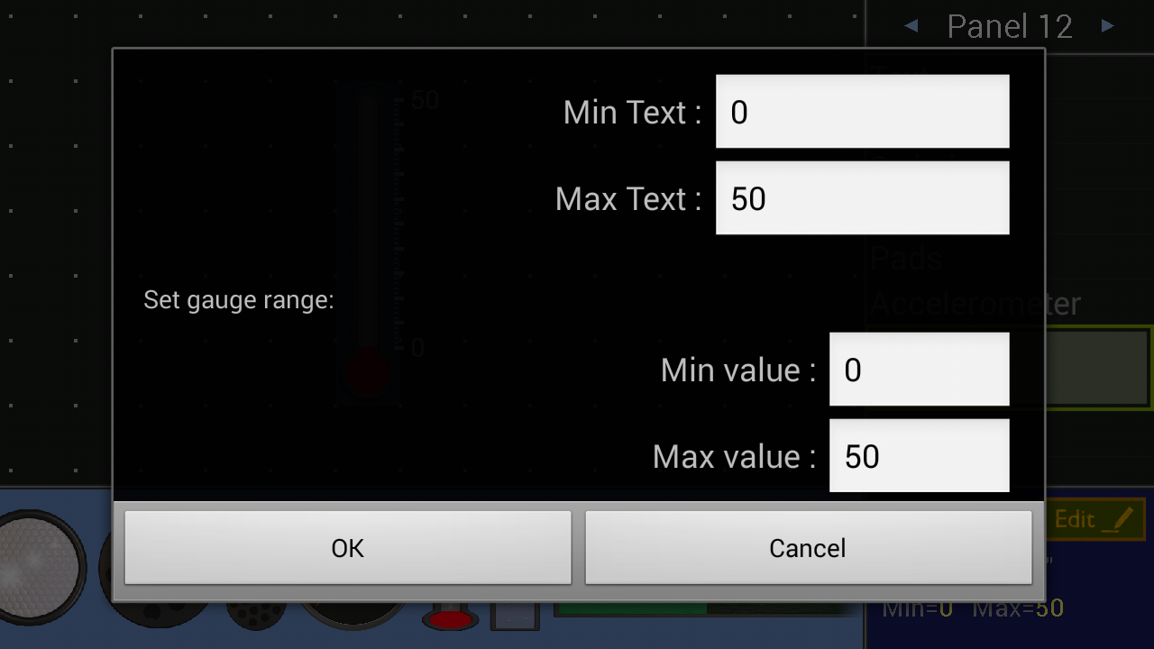 In den Feldern "Set gauge range" muss man angeben, bei welcher Zahl der minimale und bei welcher Zahl der maximale Ausschlag sein soll. in diesem Beispiel heißt das: