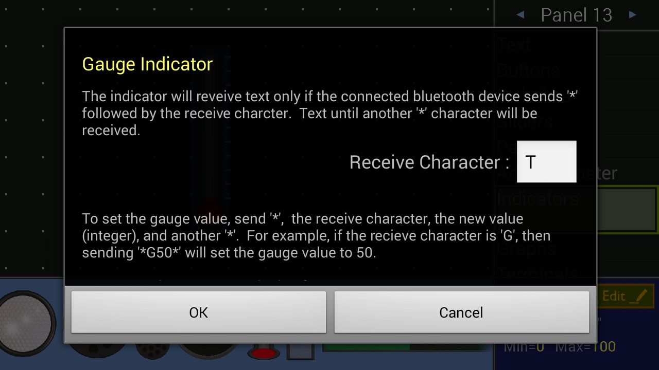 Zuerst kann man das "Reicieve Character" aussuchen. Das ist das Zeichen, welches die App braucht um die Daten für die Balkenanzeige zu erkennen. In diesem Fall ist es der Buchstabe 'T'. Die App erwartet also zuerst das Zeichen '*', dann ein 'T'. Danach folgen die Zahlen, woraus die App die Balkenanzeige darstellt, also eine Zahl. Zum Abschluss muss noch das Zeichen '*' gesendet werden.
