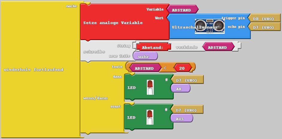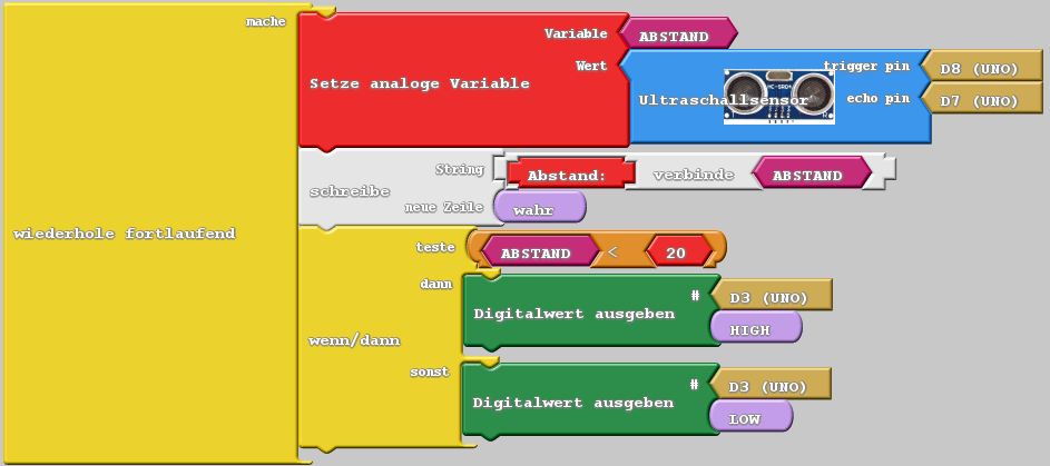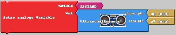 An Pin 8 wird ein Signal ausgegeben, daraufhin sendet der Sensor einen Pieps. Sobald der Sensor das Echo empfängt, legt er an Pin 7 ein HIGH-Signal an. Aus der Zeit zwischen Pieps und Echo wird die Entfernung berechnet und unter dem Namen „Abstand“ gespeichert.