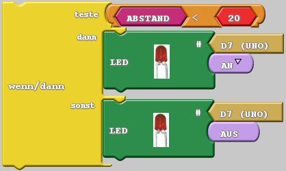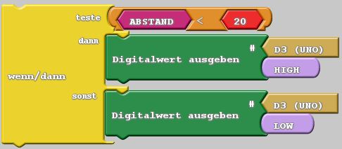 Wenn die der Wert der Variablen „ABSTAND“ kleiner als 20 ist, dann soll an Pin 3 ein HIGH gesendet werden (LED ist an) , Wenn nicht dann soll ein LOW gesendet werden (LED ist aus)