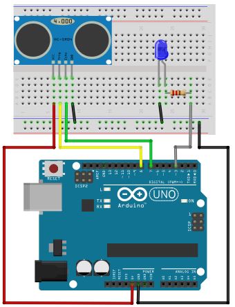 Aufbau der SchaltungDer Ultraschallsensor ist ein Ultraschallsender und –Empfänger in einem. Bekommt er vom Arduino ein 5V Signal (HIGH) an den Trigger-Pin (hier Pin 8), sendet er einen Ultraschallpieps aus.