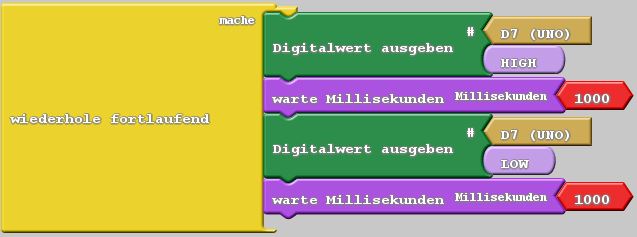 Alle Blöcke innerhalb werden nacheinander ausgeführt. Nach dem letzten Block springt das Programm zum ersten zurück. Die Blöcke werden ausgeführt, so lange der Arduino in Betrieb ist.