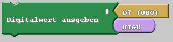 Pin 7 wird als Ausgang definiert. An ihm wird eine Spannung von 5 Volt angelegt (HIGH). Die LED wird also eingeschaltet.