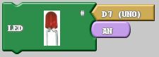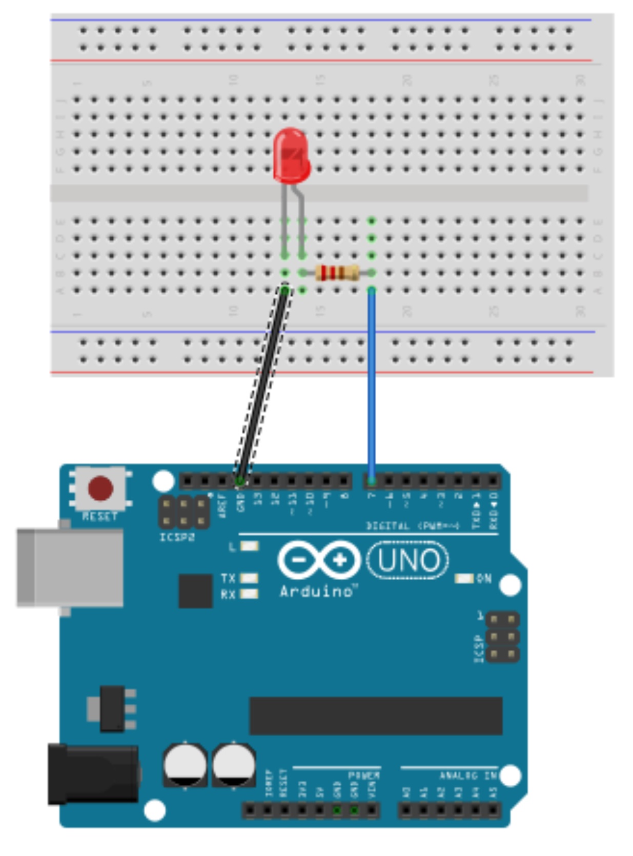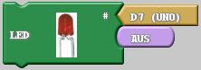 BeschreibungDie LED wird mit der Anode, zusammen mit einem Vorwiderstand, an einen der digitalen Ausgänge an den Arduino (hier Pin 7) angeschlossen. Die Kathode der LED wird an GND angeschlossen. |