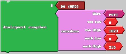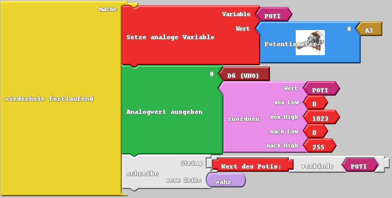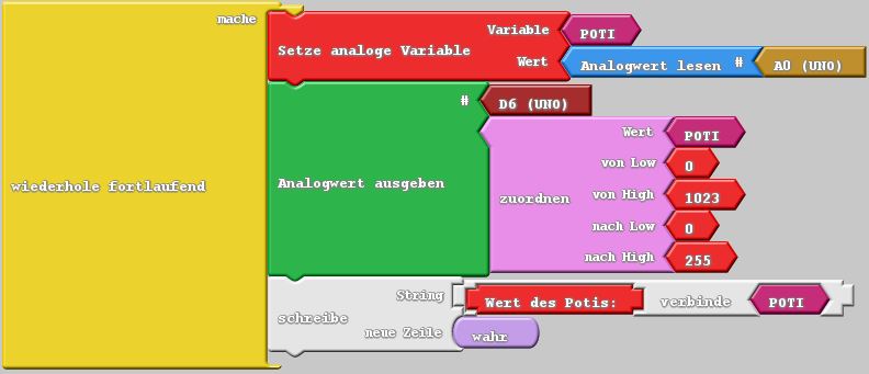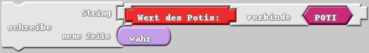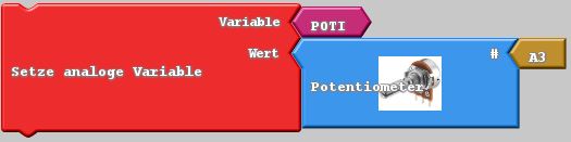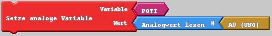 Der Wert, der anhand der Spannung am analogen Eingang A0 berechnet wird (zwischen 0 und 1023) wird unter dem Namen „POTI“ gespeichert.