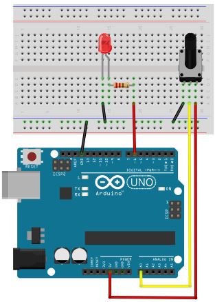 BeschreibungEin Potentiometer (Poti) ist ein Widerstand, den man Verändern kann, wenn man an der Achse dreht. Der Wert des Widerstandes variiert von 0Ω bis zum aufgedruckten Wert. Er bildet einen Spannungsteiler. Schließt man die äußeren Anschlüsse an 5V und GND, dann kann man am mittleren Anschluss eine Spannung abgreifen, die (je nach Achsstellung) zwischen 0V und 5V liegt. Diese Spannung wird am analogen Eingang A0 gemessen und intern in einen Wert zwischen 0 und 1023 umgewandelt. |