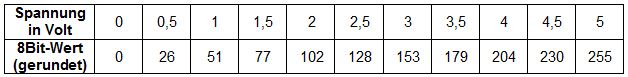 - Dabei entspricht 0V dem Wert 0 und 5V dem Wert 255.
