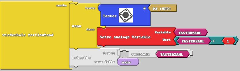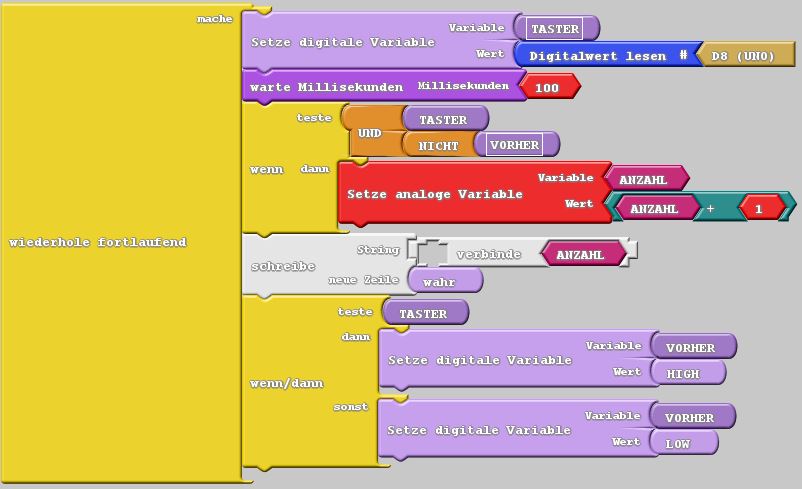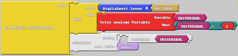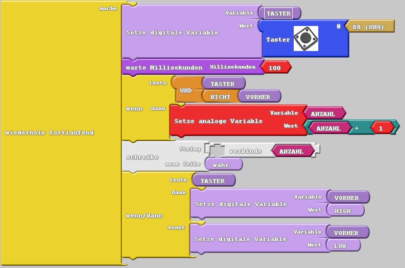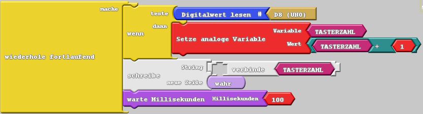 Die erste Überlegung ist, dass man eine Variable „TASTERZAHL“ definiert, die erhöht wird, wenn am digitalen Pin 8 ein HIGH anliegt.
