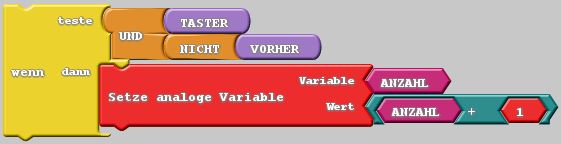 Es wird überprüft ob die Variable „TASTER“ den Wert „wahr“ hat und ob die Variable „VORHER“ den Wert „falsch“ hat. Wenn beides zutrifft, dann wird der Wert der Variable „ANZAHL“ um 1 erhöht.