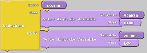 Es wird überprüft, ob der Wert der Variable „TASTER“ „wahr“ ist. Falls ja, dann erhält die Variable „VORHER“ den Wert „wahr“, sonst den erhält sie den Wert „falsch“.