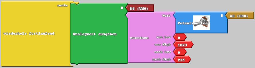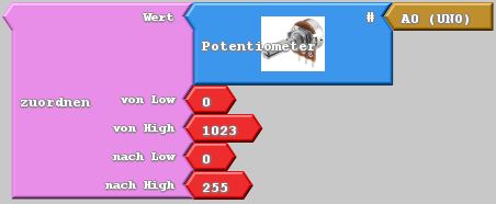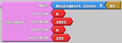Die Spannung am analogen Eingang A0 wird gemessen (0V bis 5V) und automatisch in einen Wert von 0 bis 1023 ungerechnet.