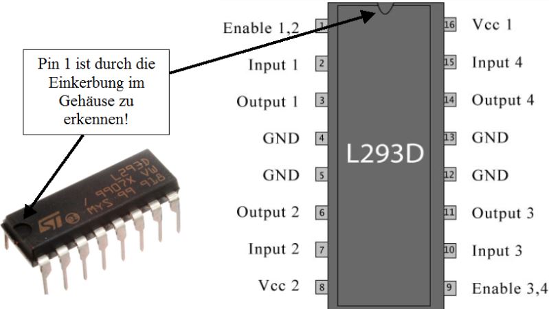 Der Motortreiber L293D beinhaltet all diese Bauteile, die sonst einzeln aufgebaut werden müssten.