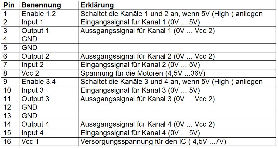 Die Eingänge für die Motoren liegen an den IC-Pins 2, 6, 10, 15. Ein „HIGH“ lässt den Motor mit der max. Drehzahl drehen, ein „LOW“ bringt ihn zum Stillstand.