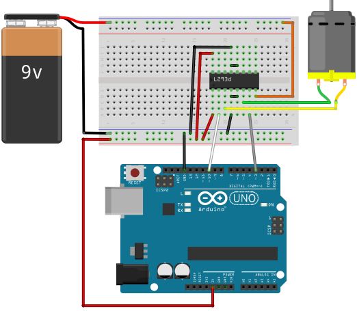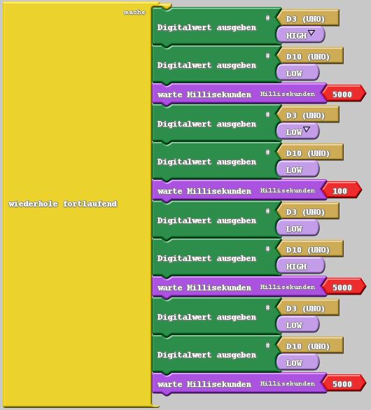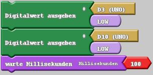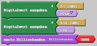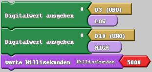 An Pin 3 wird eine Spannung von 5V (HIGH) angelegt, an Pin 10 wird keine Spannung angelegt, (LOW). Der Motor dreht sich in eine Richtung und zwar 5 Sekunden lang.