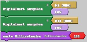 An beide Pins wird keine Spannung angelegt (LOW). Es wird 100 Millisekunden gewartet. Der Motor stoppt und kann zur Ruhe kommen.