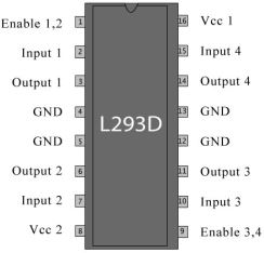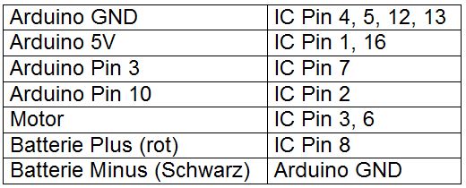 Zur Wiederholung noch einmal die Pin Belegung am Motortreiber IC L293D: