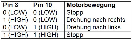 Je nachdem, an welchem Pin welche Spannung anliegt, dreht sich der Motor nun nach rechts, links oder gar nicht: